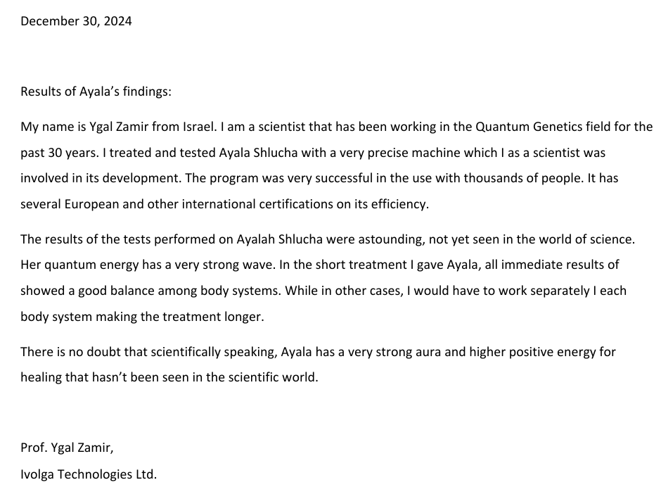 כ30 שנה, אף הוא אישר את איילה ואף כתב מכתב וחתם עליו: "לאיילה אנרגית ריפוי חזקה במיוחד שטרם נראתה בעולם המדע" { ניתן לראות בדף הבית באתר את המכתב במלואו }